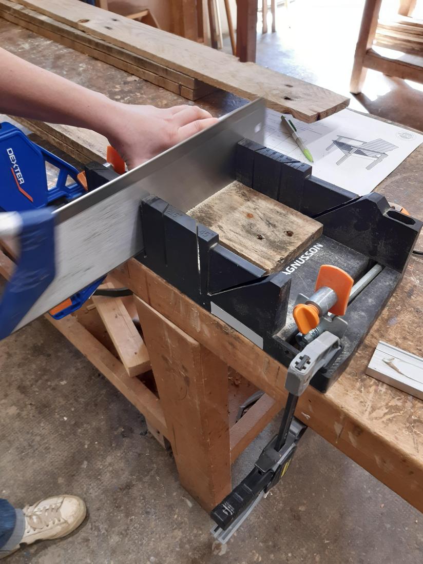 Un premier temps est consacré à préparer le bois de récupération pour le rendre utilisable – Comment démonter une palette et retirer les clous ? (plusieurs techniques selon les types de palettes et les outils à disposition) –, puis lecture du plan pour préparer le débit.