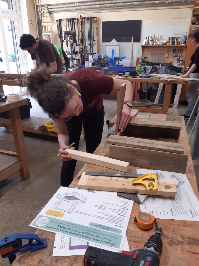 Les participant.e.s fabriquent ensuite l'objet étape par étape en (re)découvrant les outils les plus adaptés et comment les utiliser correctement.